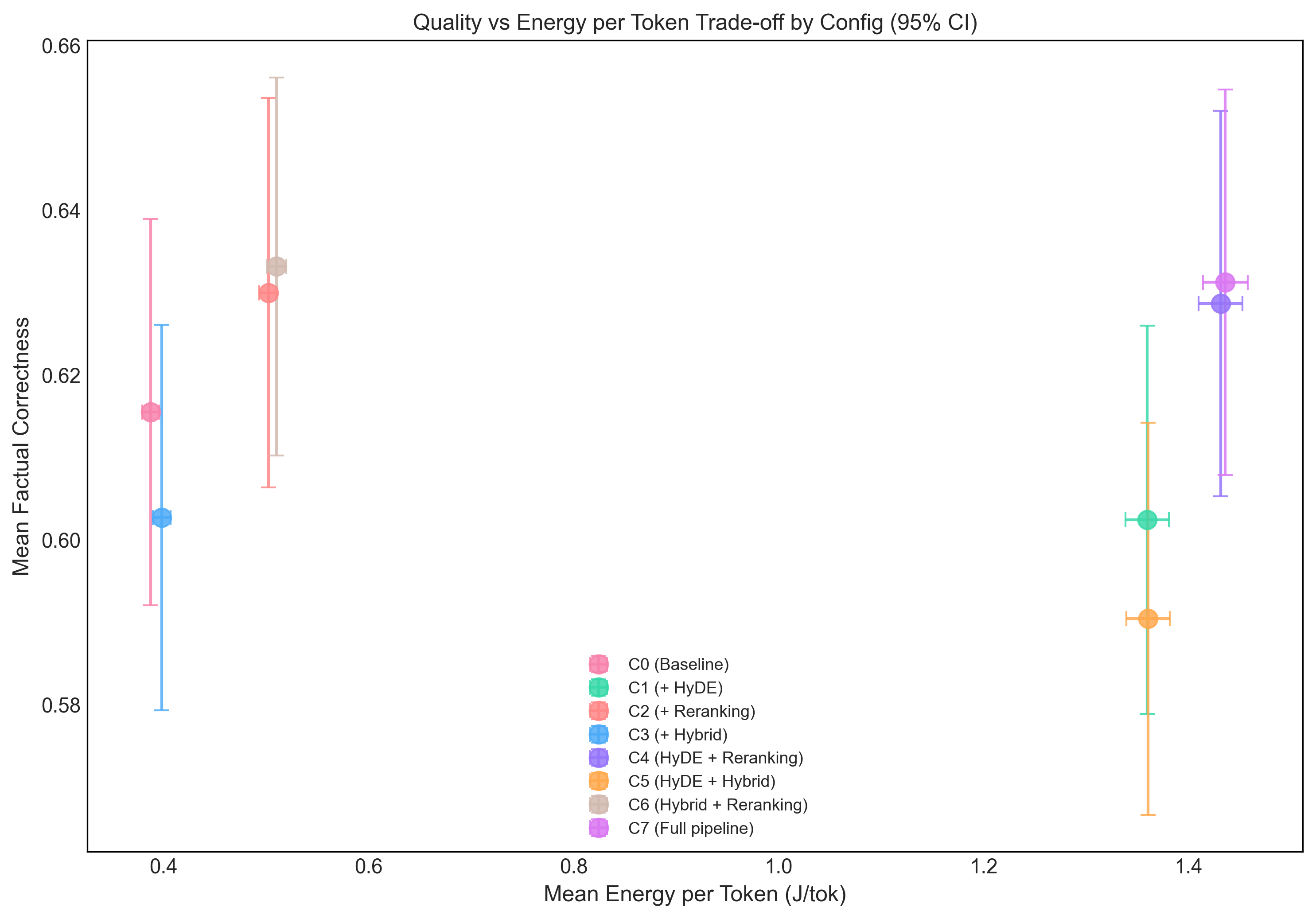 - Implication for RAG design: Energy optimization in modular RAG should focus on module-level efficiency (making HyDE cheaper) rather than per-query activation decisions